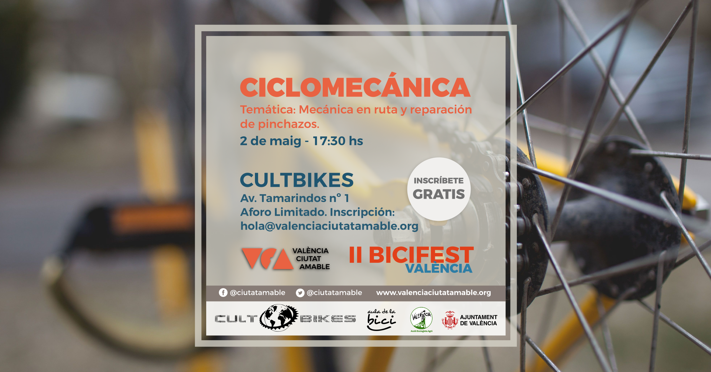 La tienda/taller de bicicletas Cultbikes School colabora con el proyecto #VlcCiutatAmable y el evento #IIBicifestValència impartiendo un taller de mecánica básica para bicicletas para todas las personas que puedan acercarse por su local, situado en Av. dels Tamarindes, 1) el próximo 2 de mayo a las 17:30 hs.